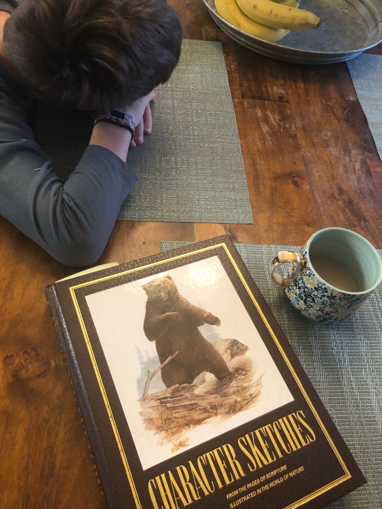 They come downstairs for breakfast and I read aloud while they eat. This works well for us because it limits chatter that can easily turn to careless words that can easily spiral and throw our day quickly off course. This time really does set the tone for our day. Currently, I am reading from Character Sketches. It is an older book, but all three of my boys are captivated by the fascinating animal facts, beautiful illustrations, and stories from Scripture.